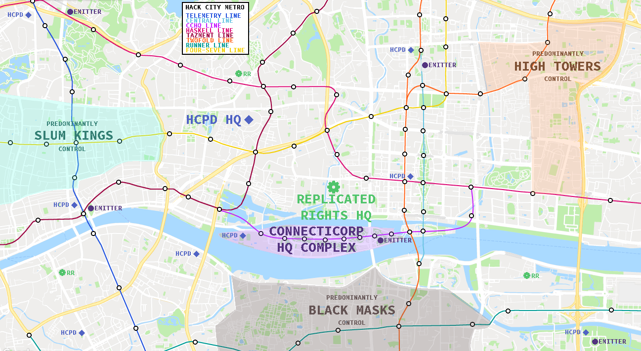 | N.B. Other areas in Hack City may very well be controlled by one of the three criminal groups, but these change over time as gang wars go on. The highlighted areas are considered to be "home turf" for each of the groups, as they have not changed hands in over ten years. |